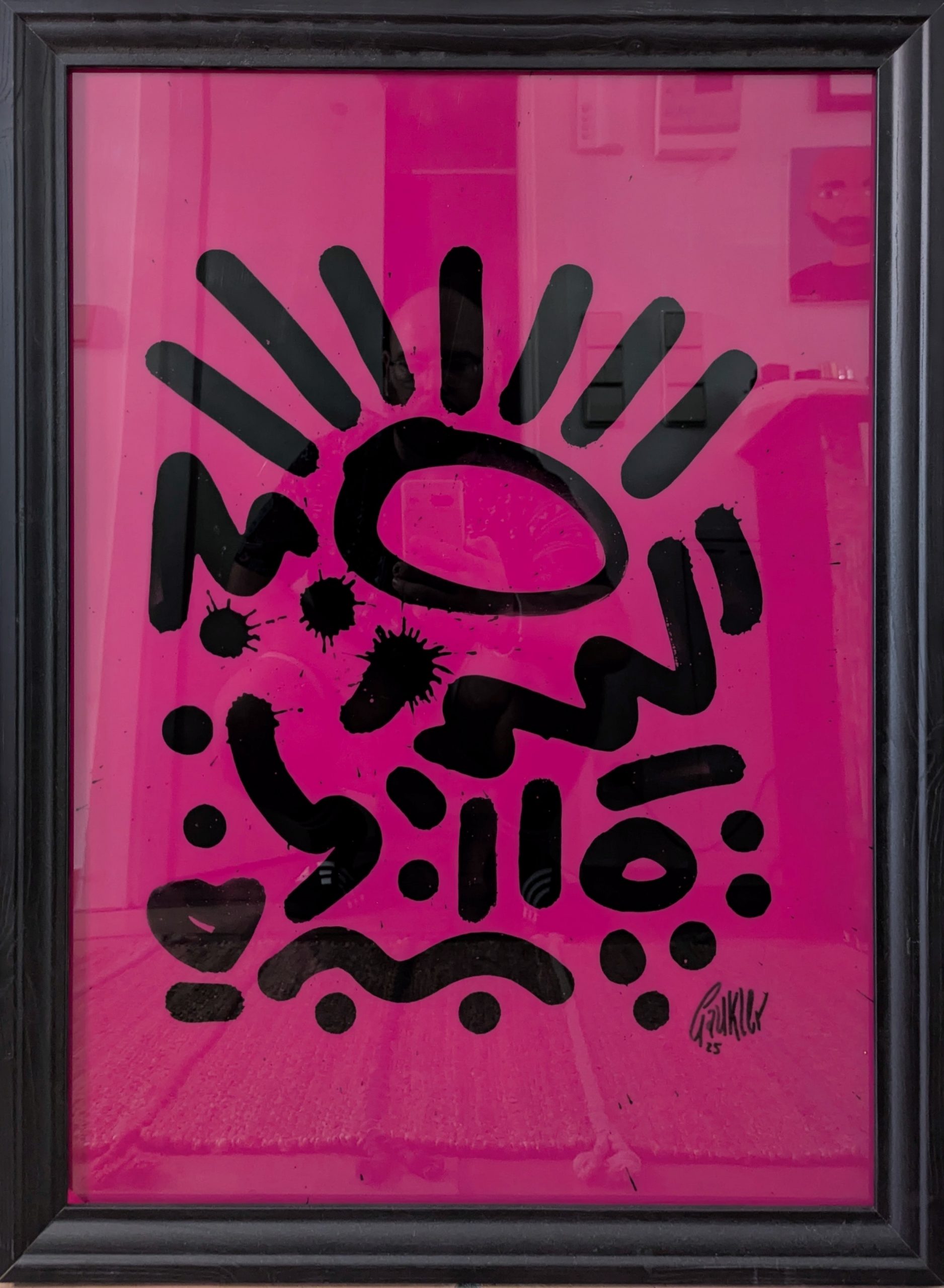 Medium: Marker und Sprühdose auf Kunststoffglas im Schwarzlackiertem Rahmen