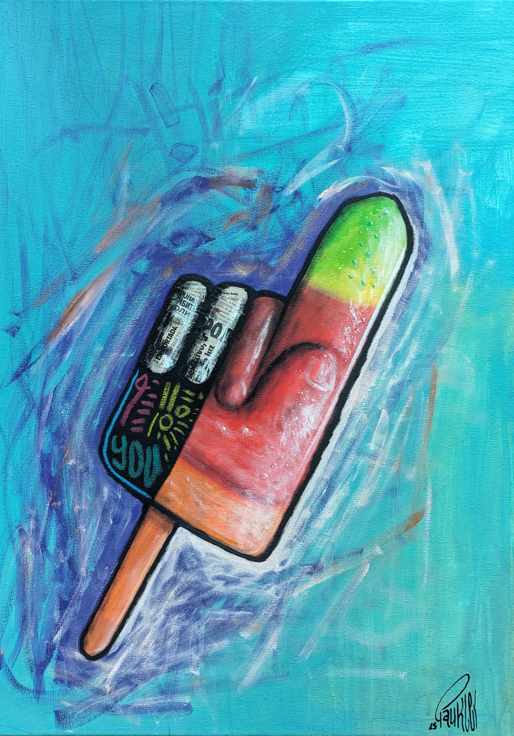 Flutschfinger. Acryl, Collage aus internationalen Zeitungen & Wachsmalkreide auf Keilrahmen