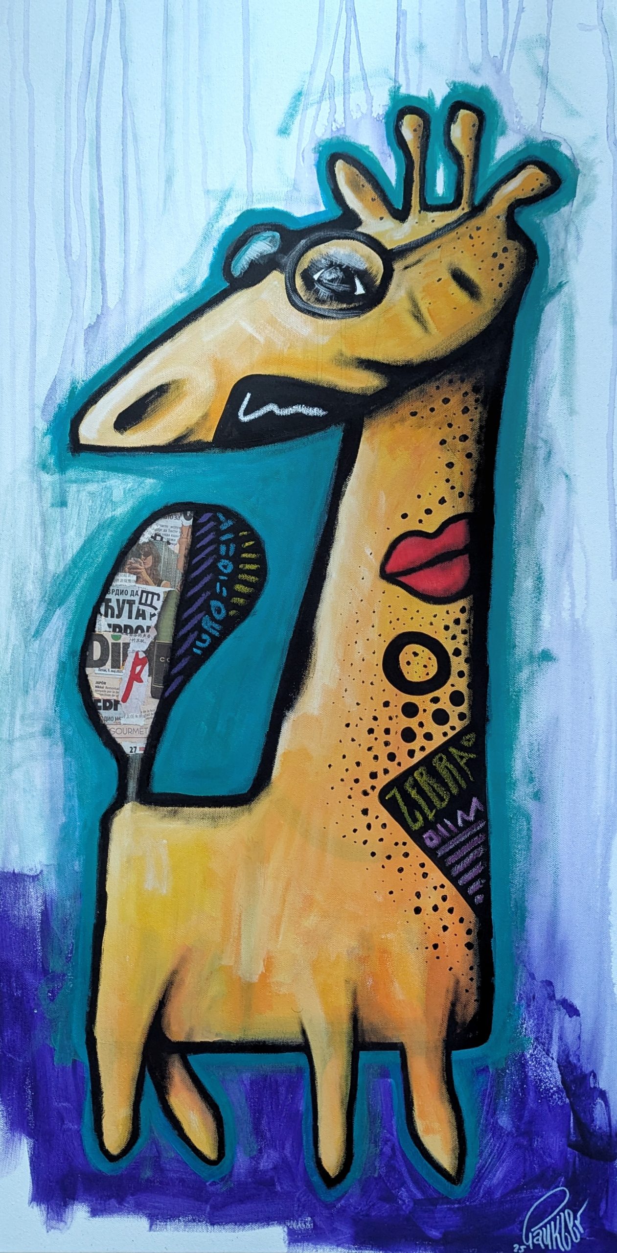 Giraffe. Acryl, Collage aus internationalen Zeitungen & Wachsmalkreide auf Keilrahmen