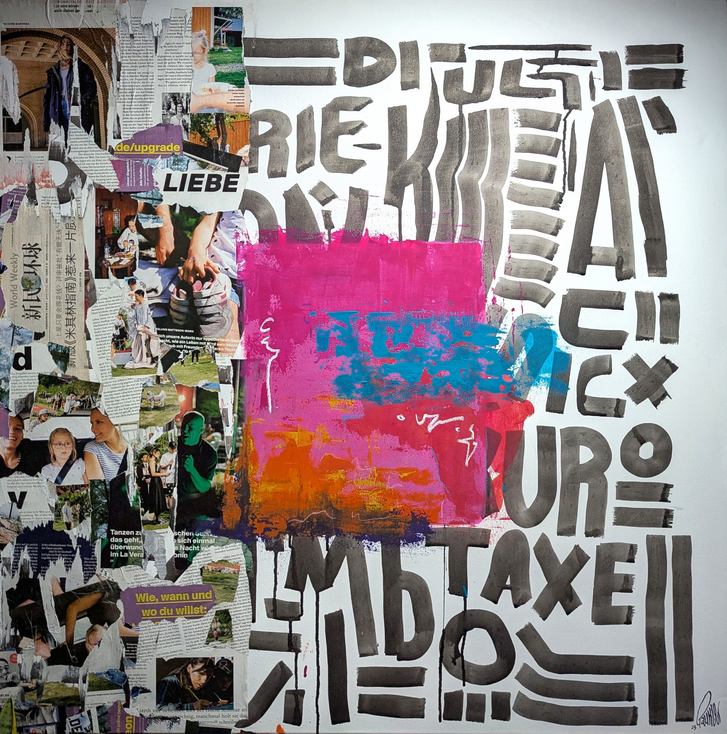 Liebe. Acryl, Collage aus Zeitungen & Wachsmalkreide auf Keilrahmen