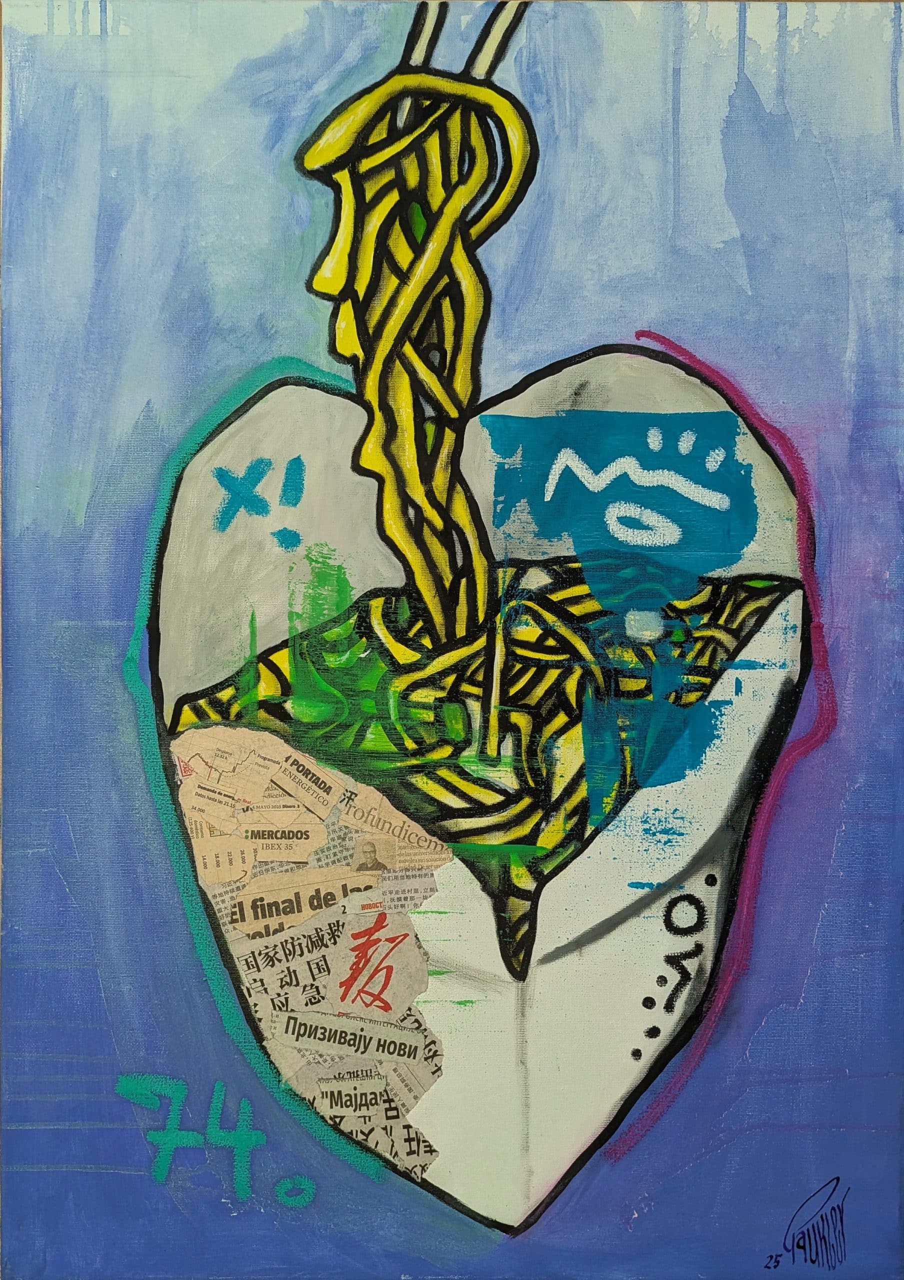 Noodles. Acryl, Collage aus internationalen Zeitungen & Wachsmalkreide auf Keilrahmen.