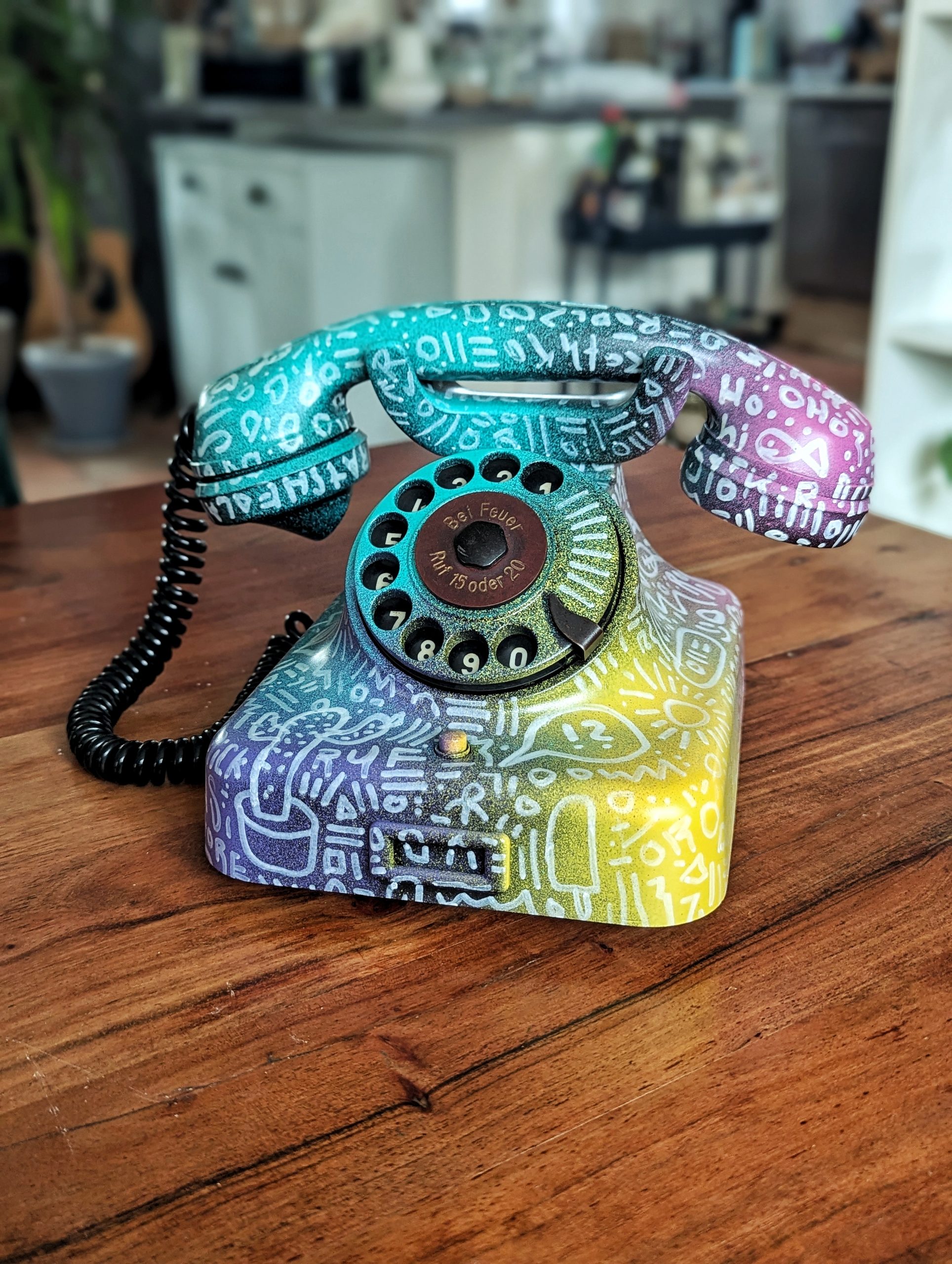 Medium: Bakelit Telefon mit Loch-Wählscheibe. Sprüdose und Marker