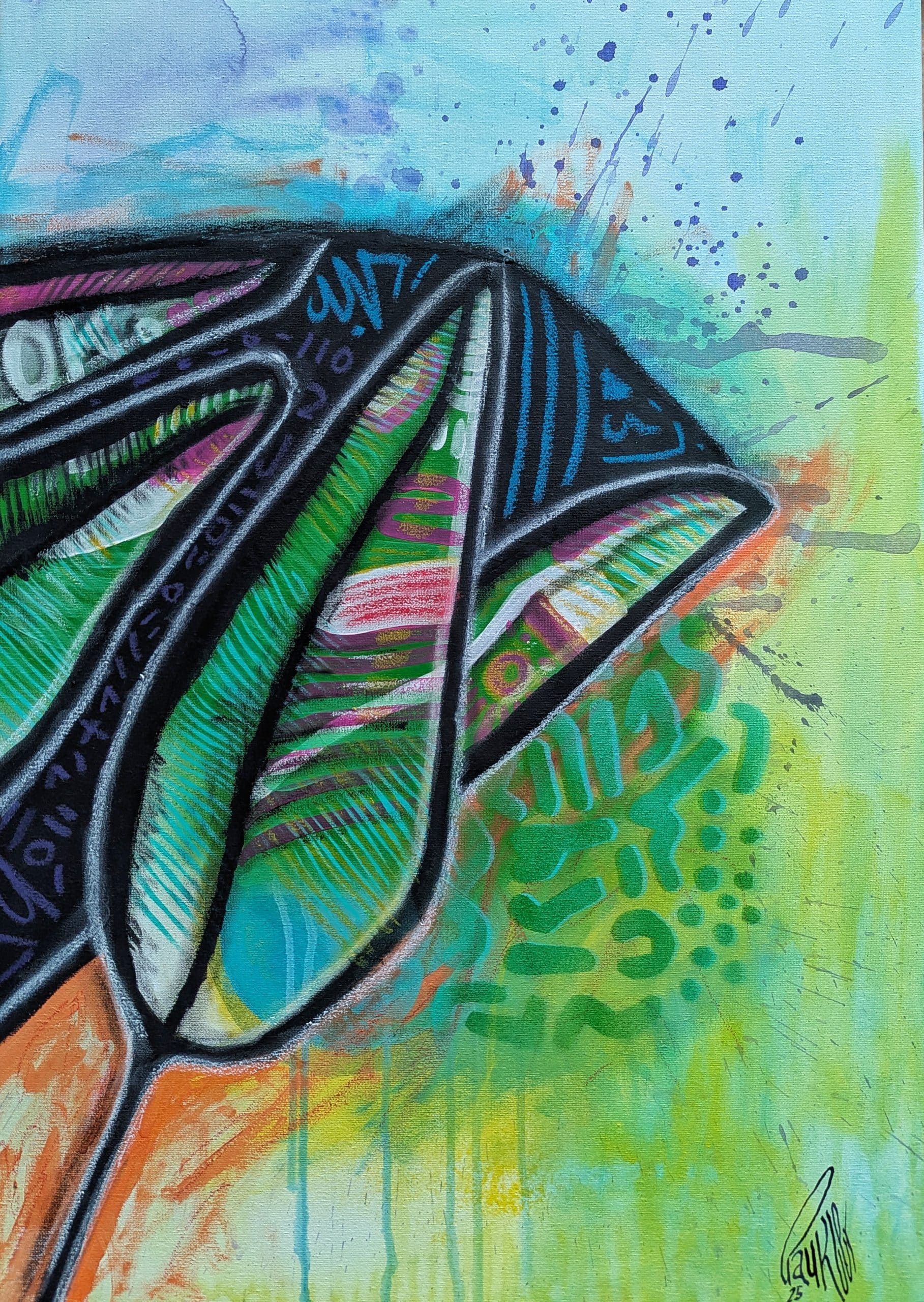 Medium: Acryl, Sprühdose & Wachsmalkreide auf Keilrahmen